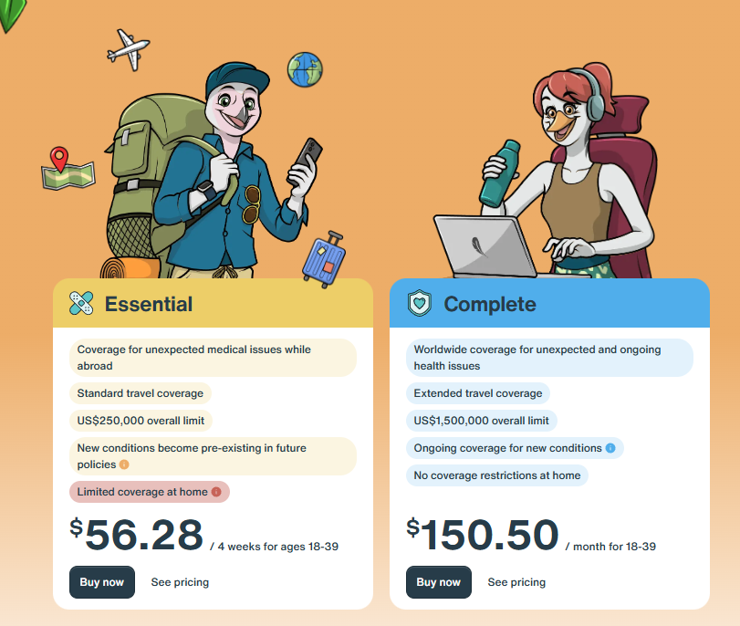 SafetyWing Nomad Insurance 數位遊牧保險分成Nomad Insurance Essential和Nomad Insurance Complete兩種,Nomad Insurance Essential可視為旅遊不便險加平安險,提供旅途中突發狀況以及緊急醫療事故理賠,而Nomad Insurance Complete像是一般健康醫療保險(例:台灣健保),包括一般健康例行檢查診療與既有身體疾病。