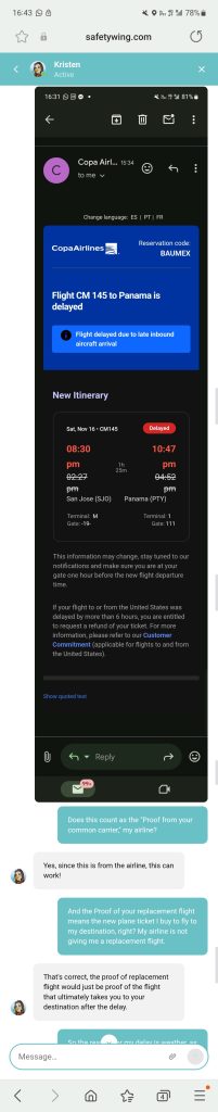 今年十一月我正從中美洲哥斯大黎加準備飛往巴拿馬的路上,班機接連四次延誤,最後取消,差點需要睡機場!好險當初我已投保SafetyWing的全球數位遊牧保險Nomad Insurance Essential,讓我在等候新班機資訊時已有備案所以不慌張,當晚臨時訂的昂貴的旅館也得到SafetyWing的理賠。
